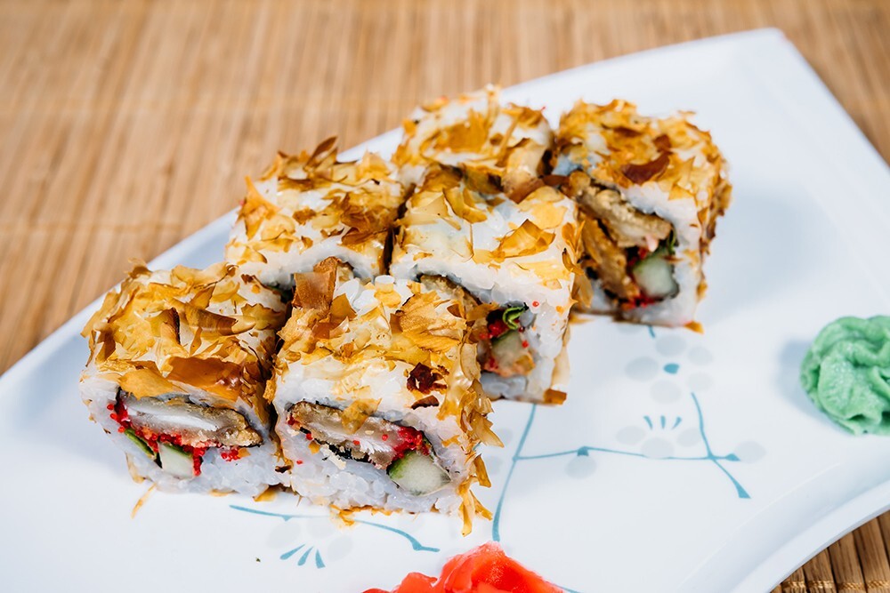 Окунь в кляре, огурец, лук зеленый, стружка тунца, масаго красная, спайс соус, рис, нори