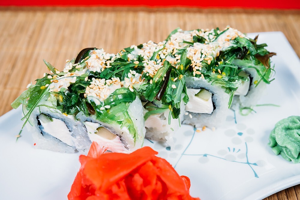 сыр, огурец, чука, кунжут, ореховый соус, рис, нори
