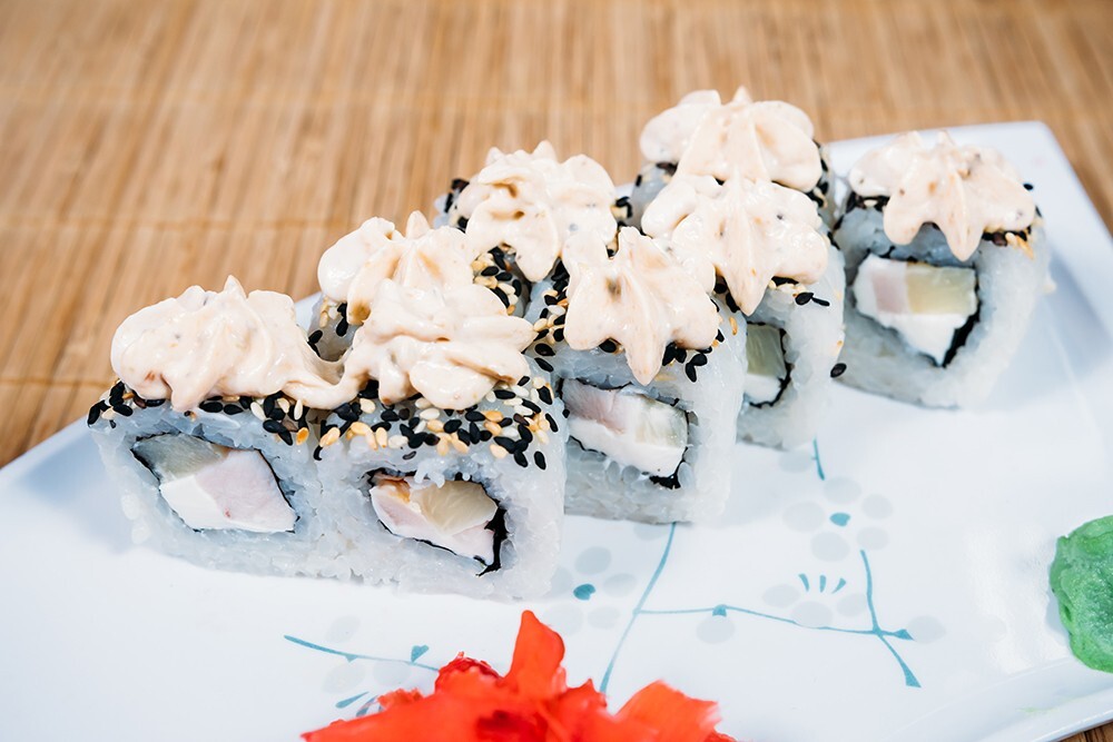 Сыр, курица копченая, ананас, соус цезарь, кунжут, рис, нори