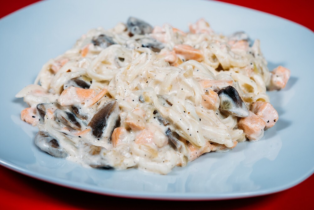 Лосось, сливки, шампиньоны, удон, чеснок, лук, масло сливочное