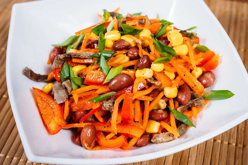 Отварной язык, фасоль красная, кукуруза, морковь по-корейски, болгарский перец, лук зелёный