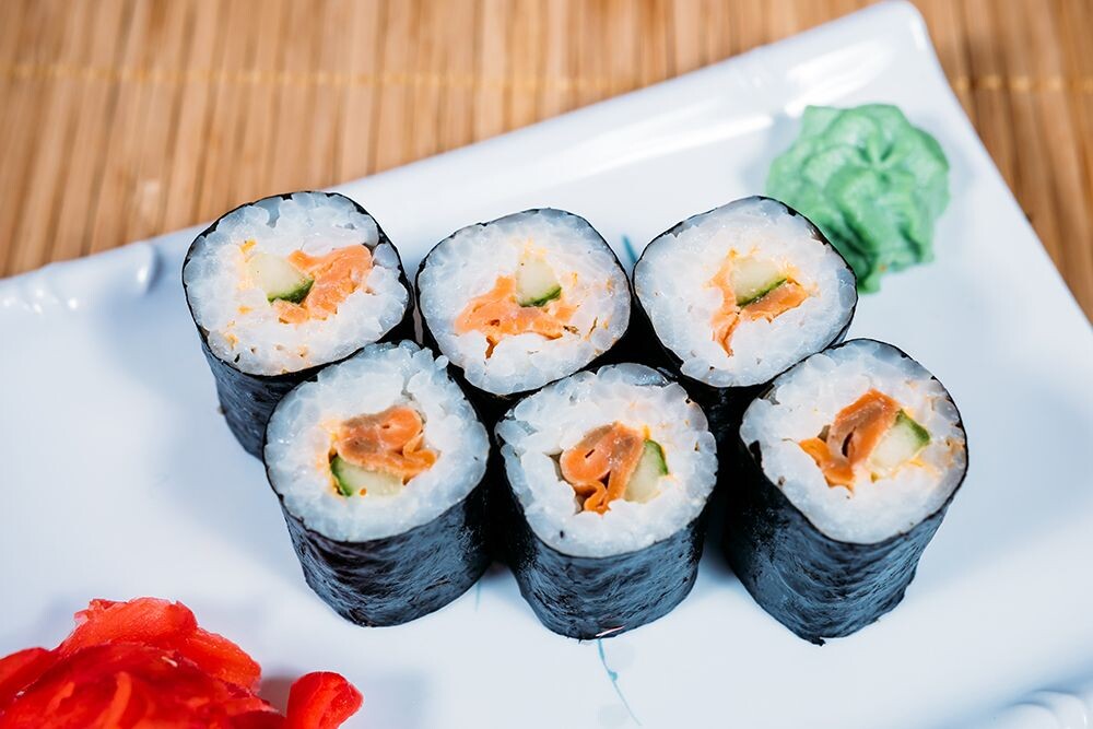 Лосось копч, огурец, спайс соус, рис, нори