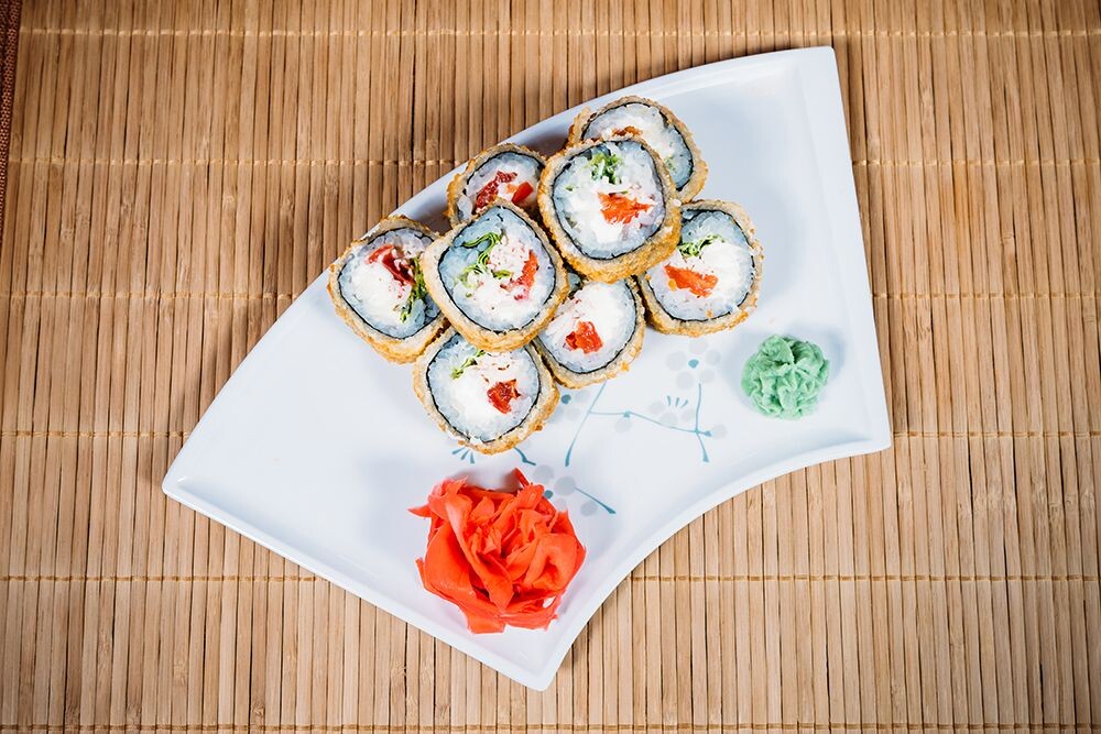 Краб, сыр, помидор, лист салата, рис, нори, темпура