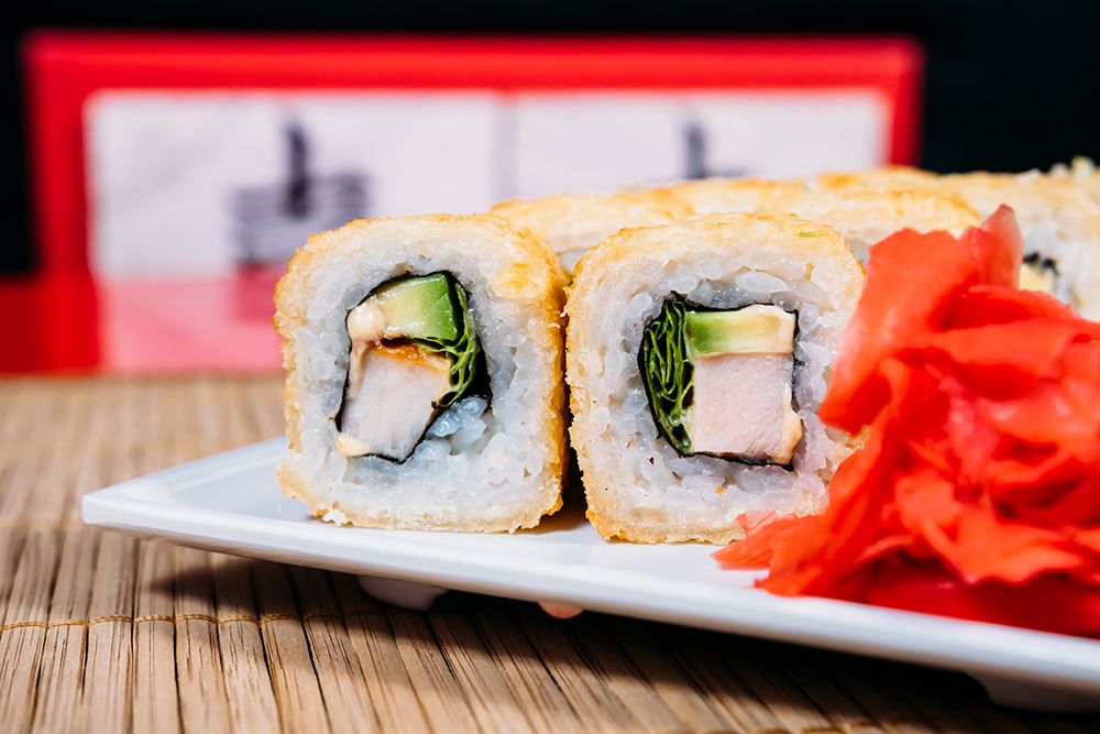 Копчёная курица, авокадо, рис, лист салата, соус цезарь, нори, темпура