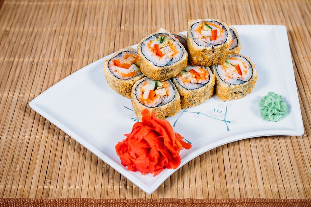 Кальмар, огурец, паприка, омлет, масаго оранжевая, васаби, спайс соус, рис, нори, темпура