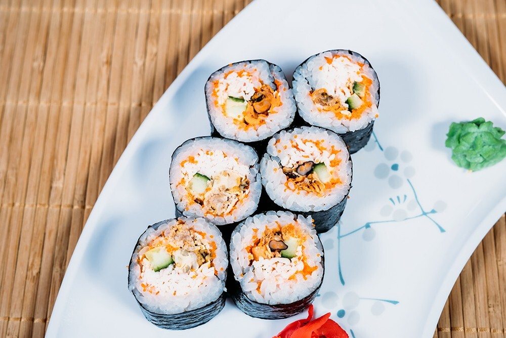 Мидии, краб, огурец, спайс соус, масаго оранжевая, рис, нори