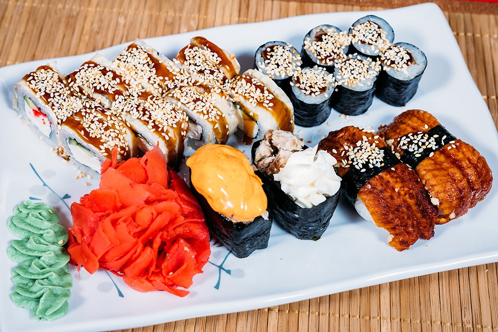 Ролл «Драгон» 1/2, ролл «Унаги Филадельфия» 1/2, ролл «Унаги маки», суши «Унаги» 2 шт, суши «Спайс унаги» , суши «Крем унаги»